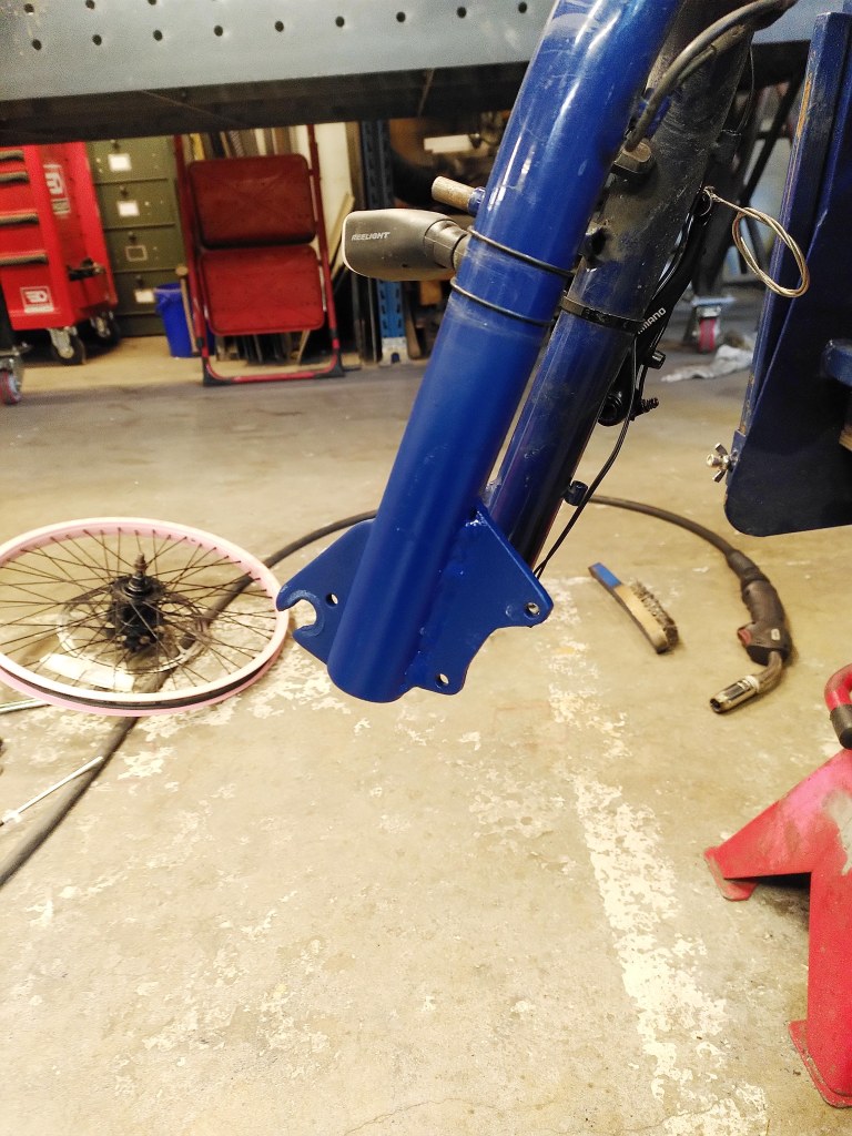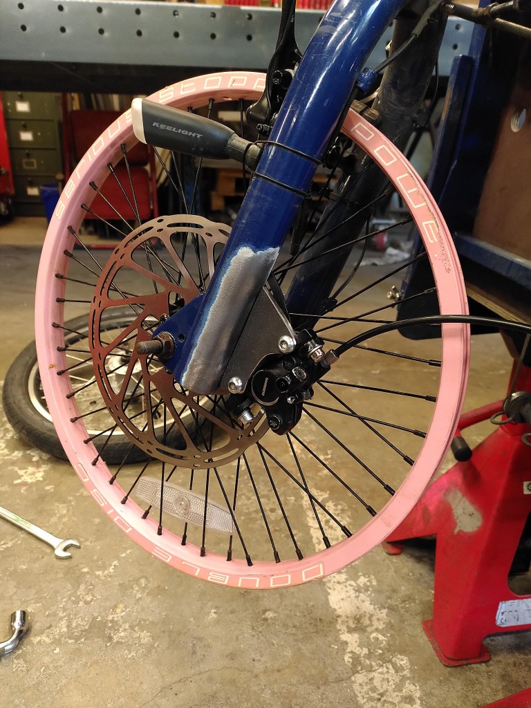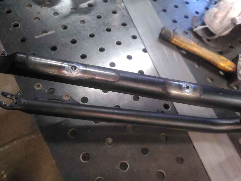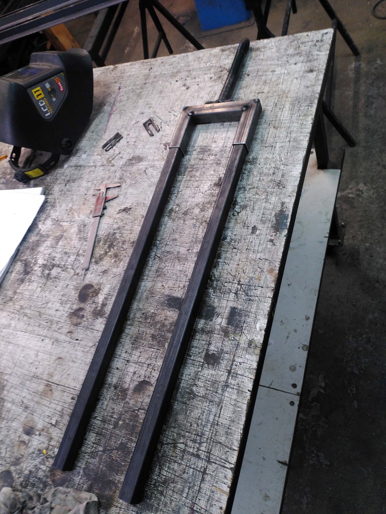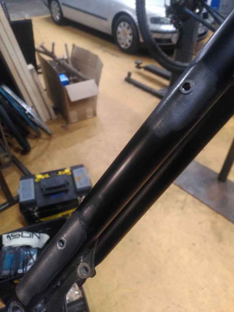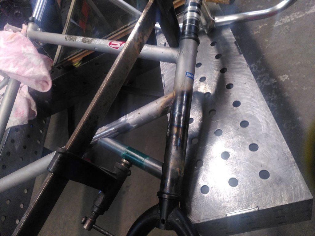 Il a fallut prolonger la douille de direction, ainsi que le pivot de la fourche (aussi fabriquer et souder une patte pour l’étrier de frein à disque), puis souder un tube de renfort pour soutenir la douille et éviter qu’elle ne se plie.