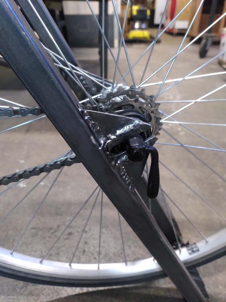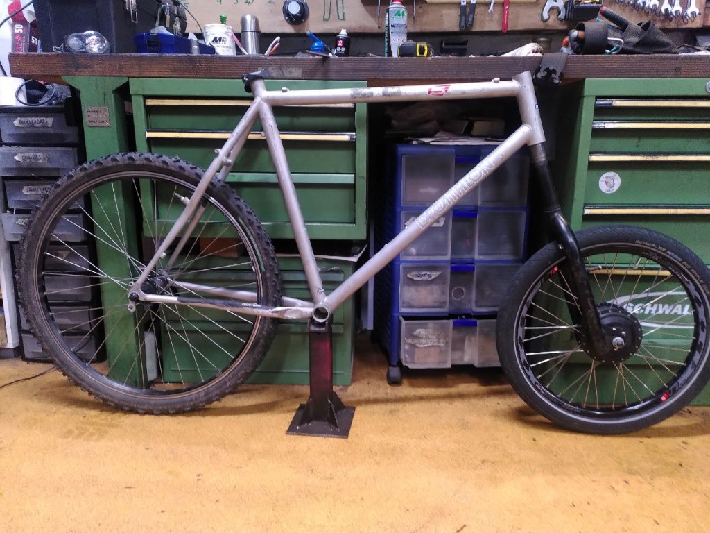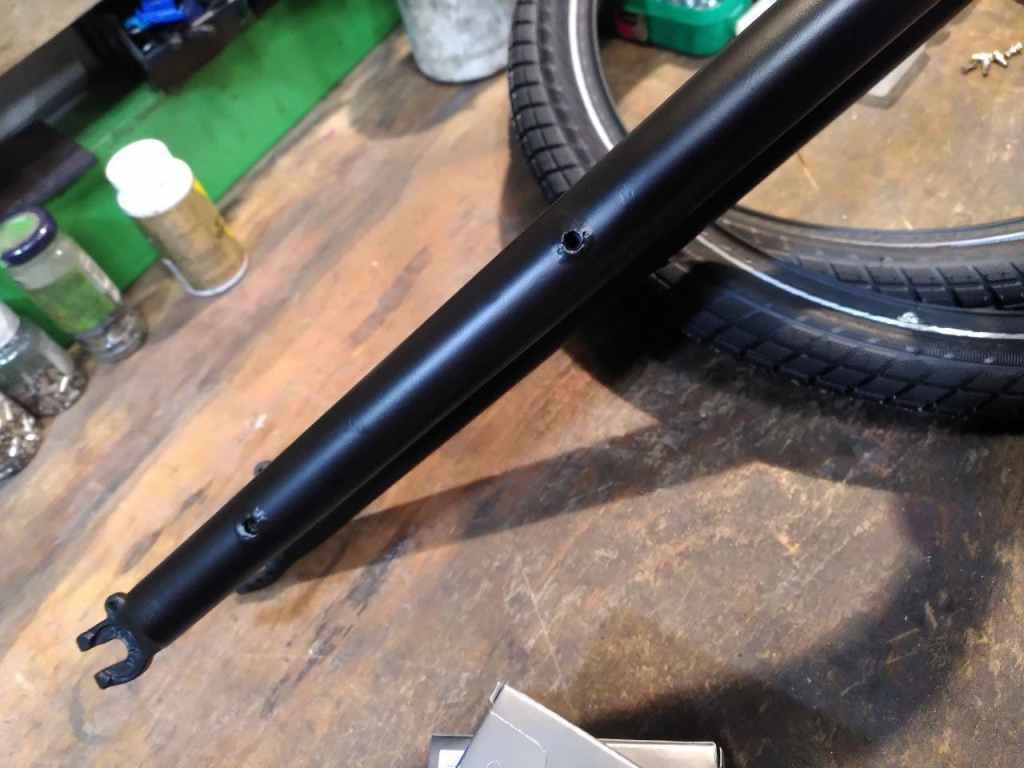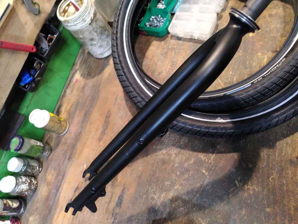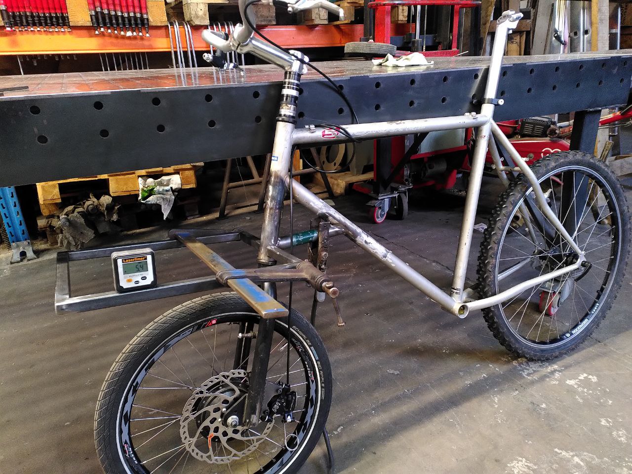 Il a fallut prolonger la douille de direction, ainsi que le pivot de la fourche (aussi fabriquer et souder une patte pour l’étrier de frein à disque), puis souder un tube de renfort pour soutenir la douille et éviter qu’elle ne se plie.