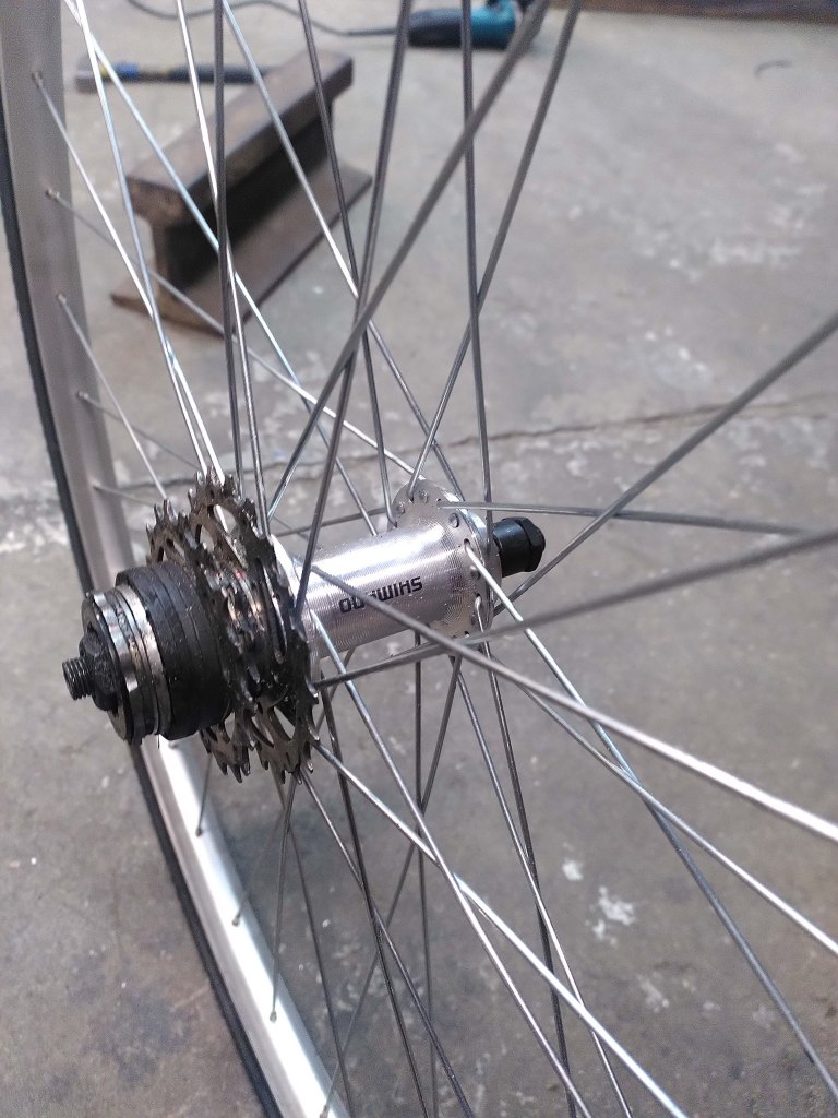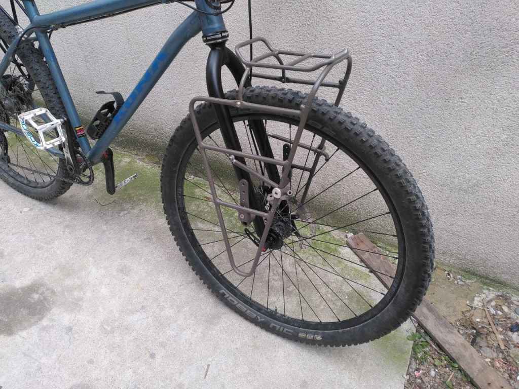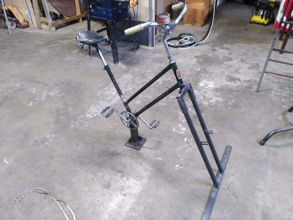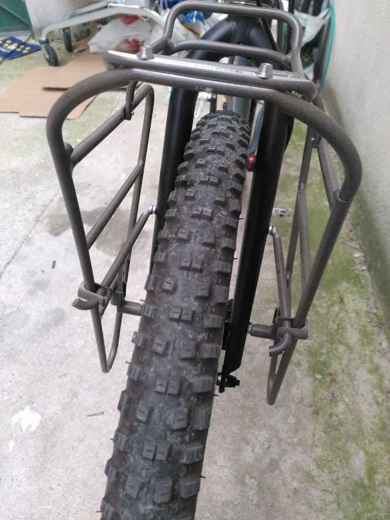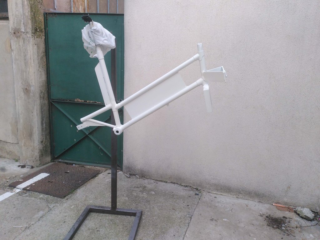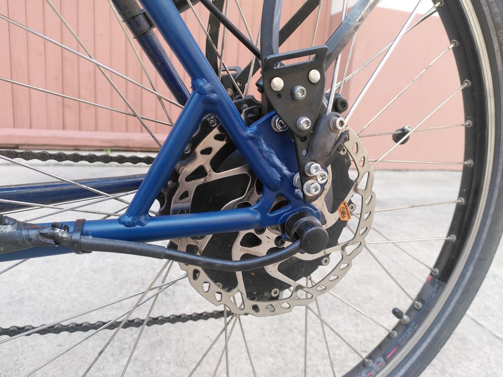 Il a fallut prolonger la douille de direction, ainsi que le pivot de la fourche (aussi fabriquer et souder une patte pour l’étrier de frein à disque), puis souder un tube de renfort pour soutenir la douille et éviter qu’elle ne se plie.