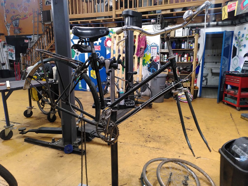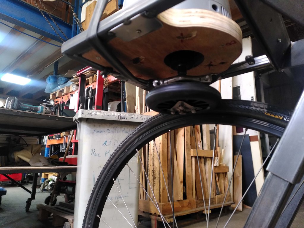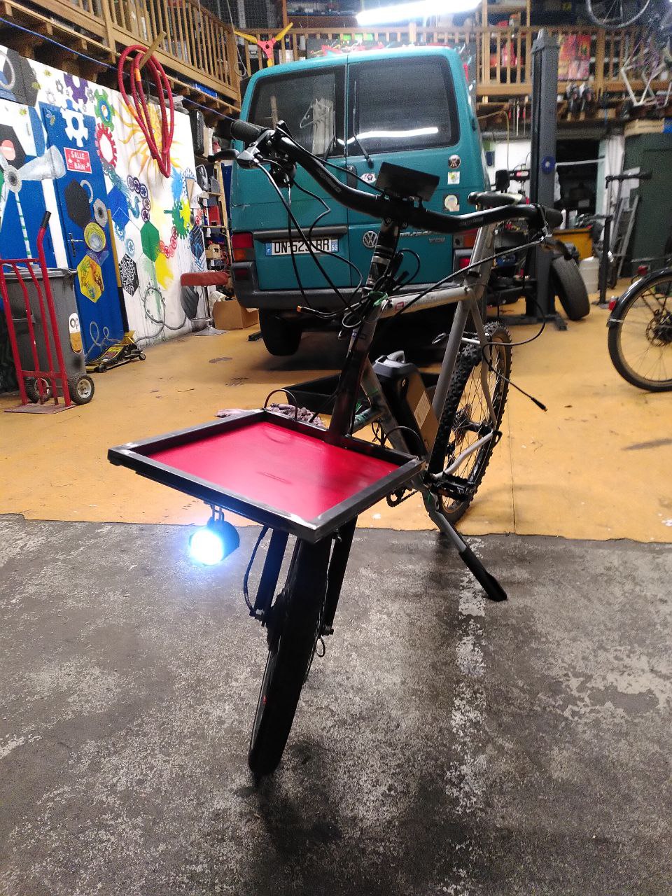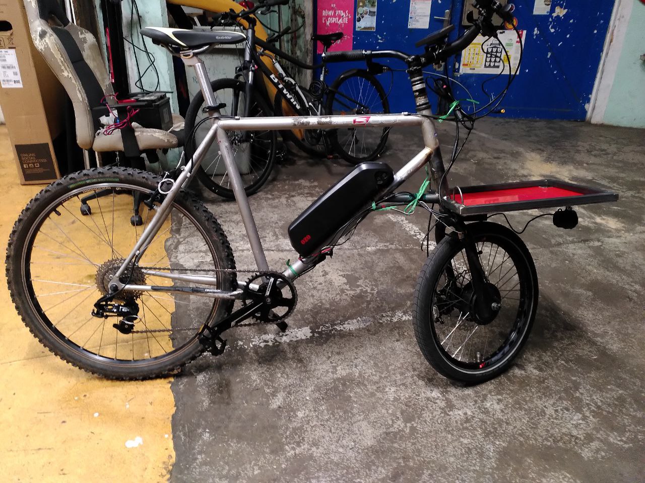 La conception du moment à l’atelier, c’est la conversion de ce cadre Rockrider 500 des années 90 en un mini biporteur à assistance électrique.