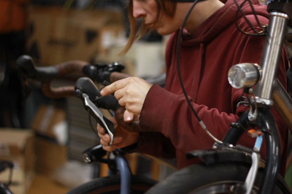 Dans cet atelier, je pratique une grande variété d’activités. Parmi elles: la réparation de vélos pour la clientèle, restauration pour la vente, constructions en métal, modification et réparation de cadres (soudage de pattes de disque, œillets), artisanat à partir de pièces recyclées, cours particuliers, vente de pièces neuves et d’occasion…
